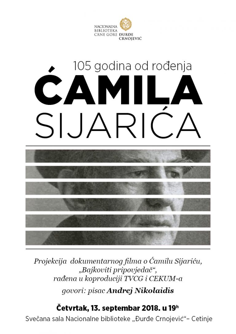 The speech on Sijarić will be given by Andrej Nikolaidis, and a documentary about Ćamil Sijarić “Bajkoviti pripovjedač”, created by Bogić Rakočević and produced in co-production with TVCG and the Center for the Preservation and Development of Minority Cultures in Montenegro, will be projected.