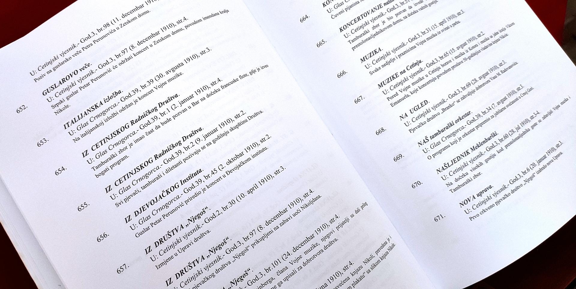 This publication, which is an important source for the study and development of musical life in Montenegro, contains 2829 bibliographic items and includes old Montenegrin periodicals, consisting of magazines and newspapers, from 1871 to 1943.