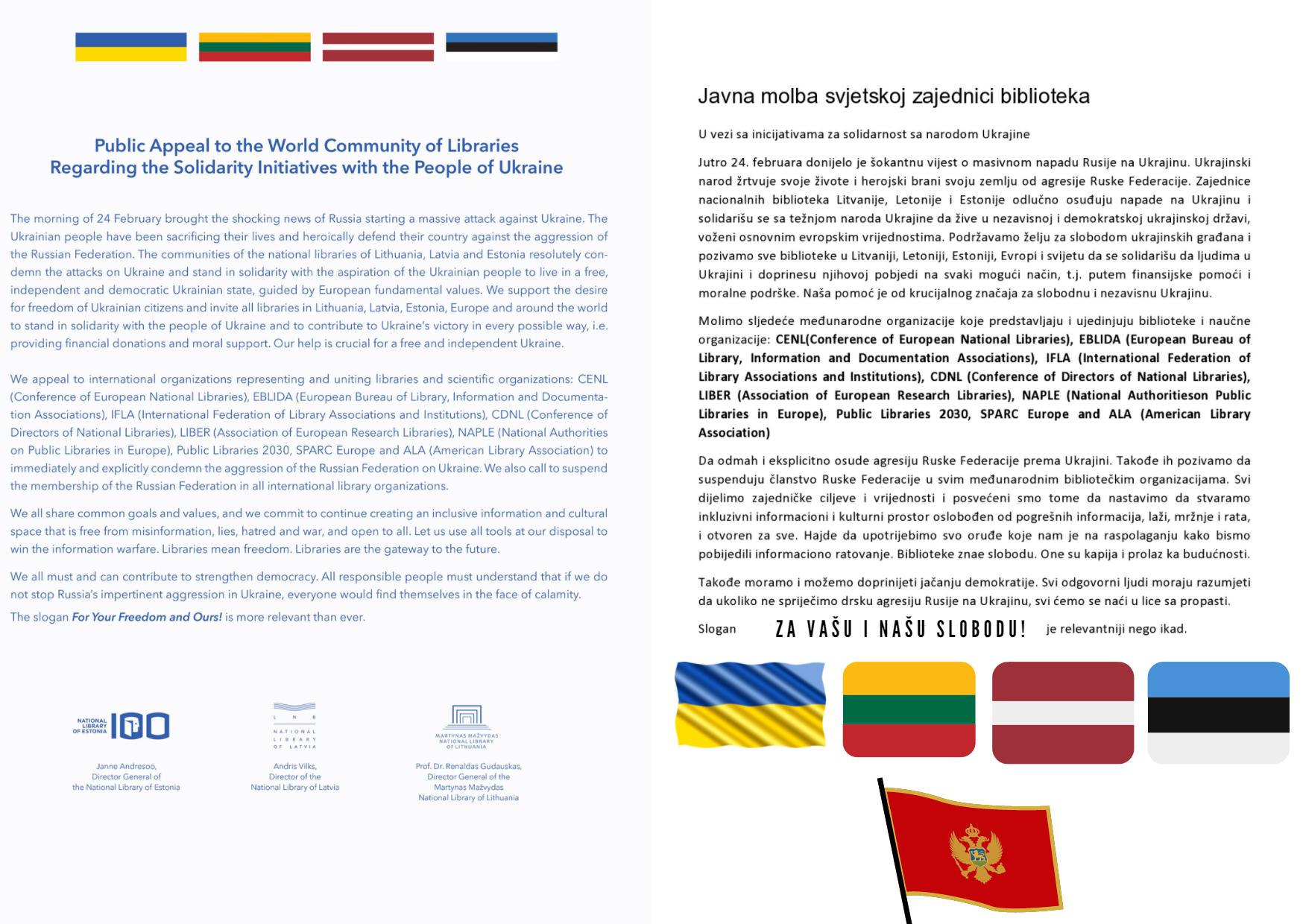 National Library of Montenegro “Đurđe Crnojević” has supported the initiative launched by the national libraries of Lithuania, Latvia and Estonia, in support of the people of Ukraine, which we share with you in English and Montenegrin language. For freedom and peace!