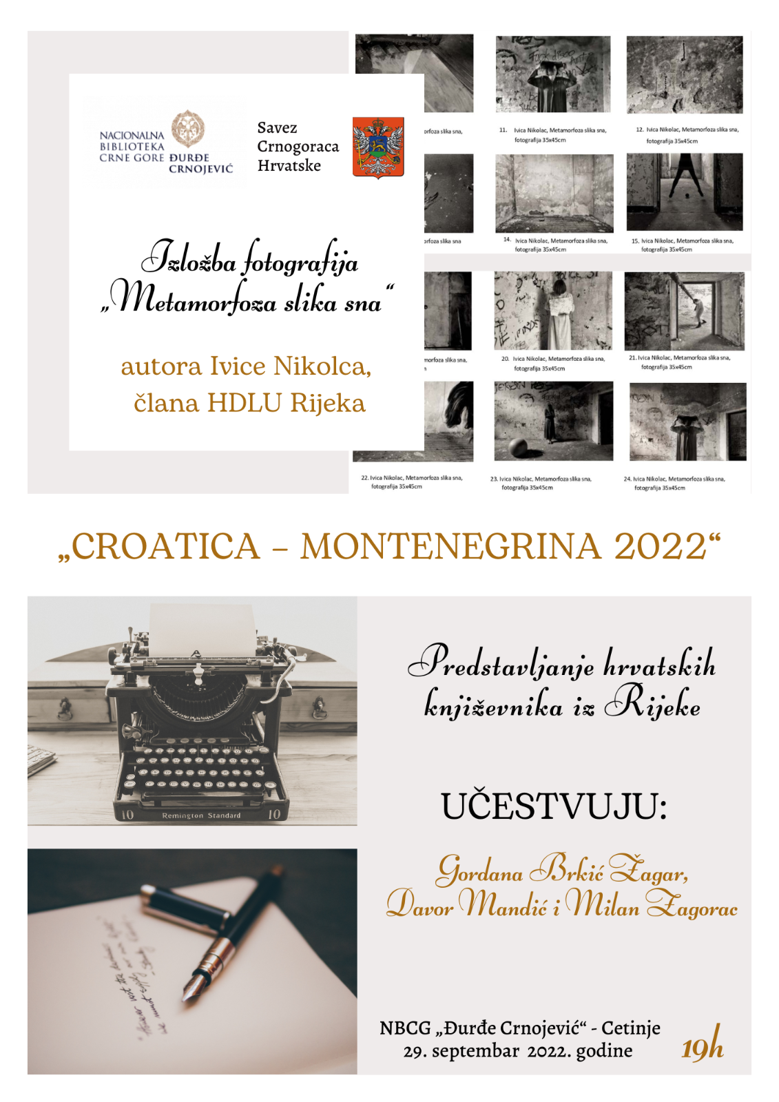 As part of the Program of International Exchange of Cultural Manifestations “CROATICA - MONTENEGRINA 2022”, the National Library of Montenegro “Đurđe Crnojević” and the Association of Montenegrins of Croatia are organizing a convenient program that includes the opening of the photo exhibition “Metamorfoza slika sna” (Metamorphosis of Dream’s Images) by Ivica Nikolac and the presentation of writers from Rijeka: Davor Mandić, Gordana Brkić Žagar and Milan Zagorec.