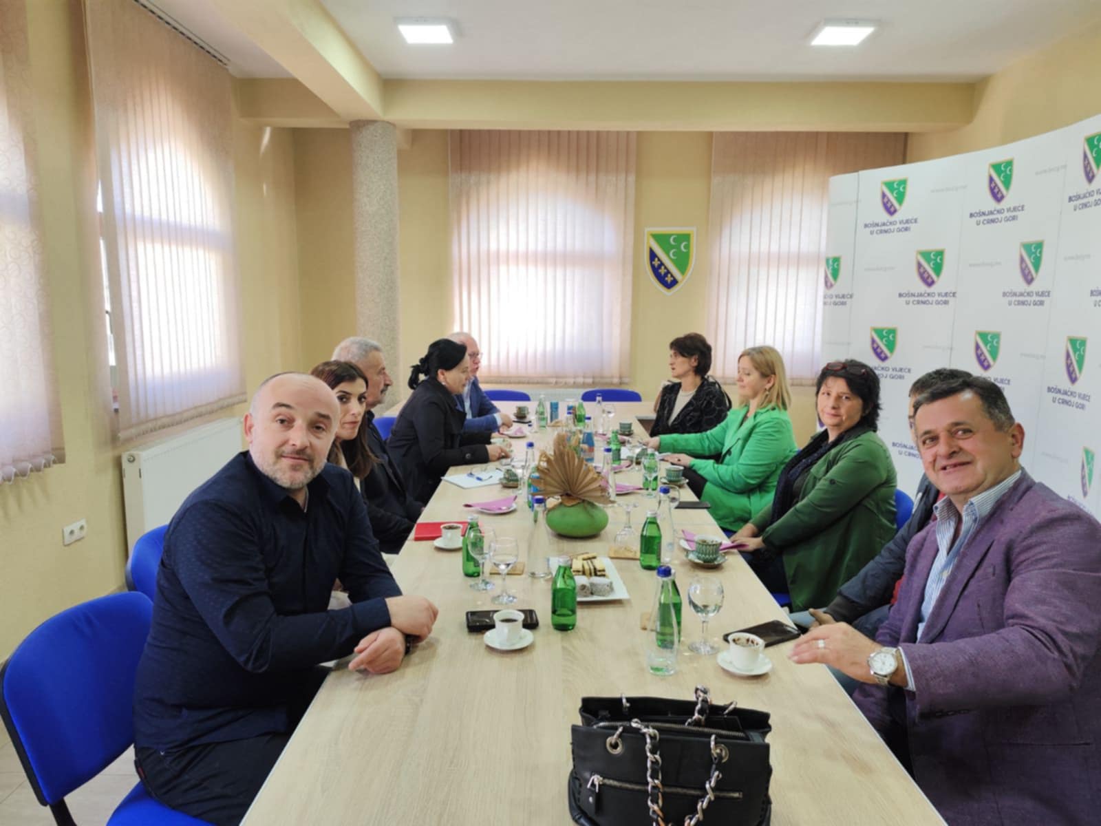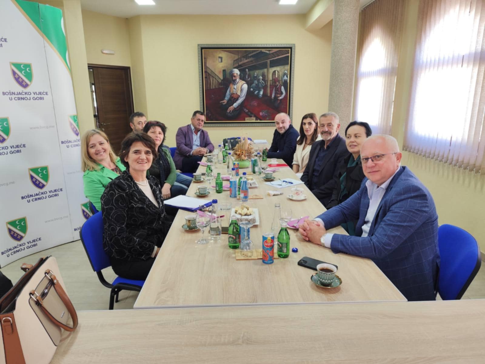 Na sastanku koji je protekao u veoma srdačnoj i kontruktivnoj atmosferi, a s obzirom da su predsjednik Mustafić i direktorica Lompar već prilikom prethodnog susreta na Cetinju razgovarali o potencijalnom uključenju biblioteke Bošnjačkog vijeća u Crnoj Gori u sistem COBSS.CG, razgovor je bio posvećen u najvećoj mjeri upoznavanju sa konkretnim preduslovima i aktivnostima neophodnim za realizaciju uključenja u sistem. Predsjednik Suljo Mustafić je upoznao sve prisutne sa uslovima koji su obezbijeđeni za funckionisanje biblioteke, uz napomenu da biblitekarka ima položeni stručni ispit, što je značajan preduslov za adekvatno poslovanje ove biblioteke, koja ima i veliki broj korisnika. Delegacija NBCG je obišla prostorije biblioteke i konstatovano je da je prostor dobro organizovan i da su publikacije već razvrstane po UDK broju. U toku sastanka je koleginica Đurđa Martinović sa bibliotekarkom Elmom Đozgić Osmanović već prikupila podatke za Zapisnik o fondu. Zaključeno je da se što prije krene u realizaciju uključenja ove značajne biblioteke i sistem COBISS.CG. U svim sadašnjim i budućim aktivnostima značajna je i pomoć i stručni savjeti i kolega iz Narodne biblioteke Rožaje.