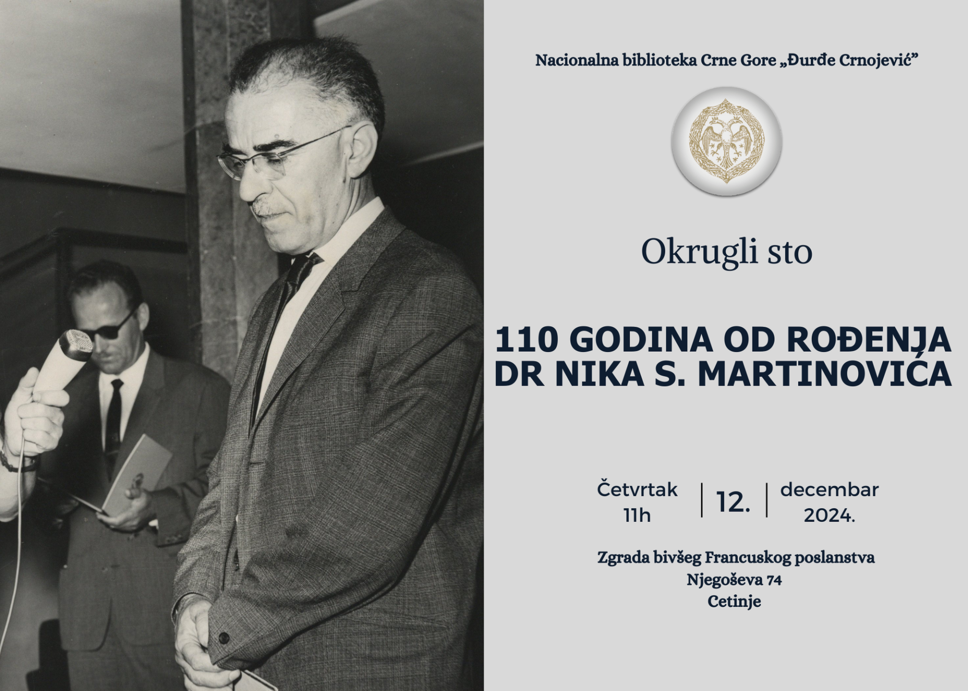 Nacionalna biblioteka Crne Gore „Đurđe Crnojević” organizuje okrugli sto pod nazivom „110 godina od rođenja dr Nika S. Martinovića” u četvrtak, 12. decembra, u zgradi bivšeg Francuskog poslanstva na Cetinju, sa početkom u 11 sati.