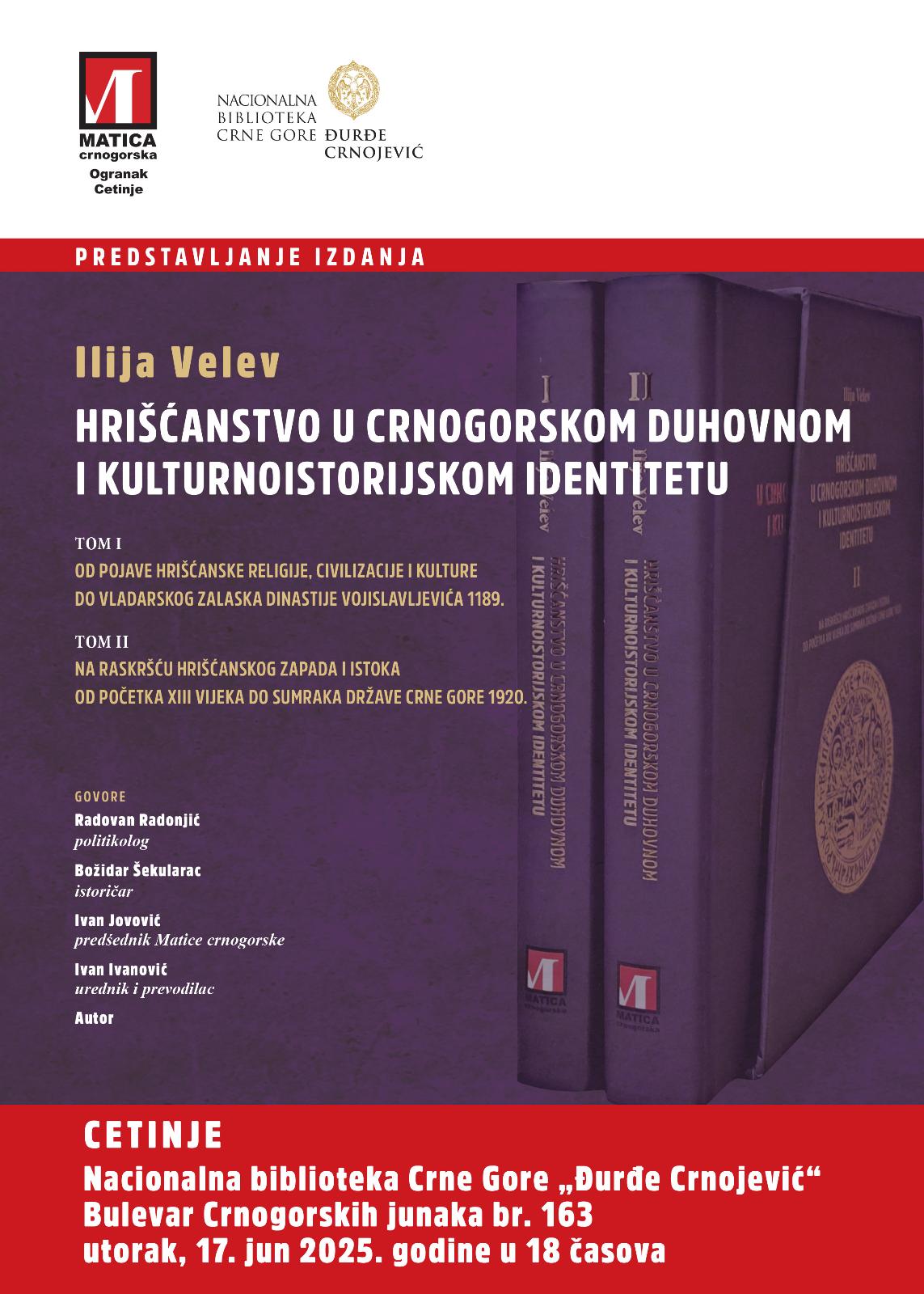 Dvotomna studija prof. dr Ilije Veleva „Hrišćanstvo u crnogorskom duhovnom i kulturnoistorijskom identitetu“ koju je Matica crnogorska objavila krajem prošle godine biće promovisana na Cetinju u utorak, 17. juna u 18 sati u Nacionalnoj biblioteci „Đurđe Crnojević“. O knjizi će govoriti, istoričar Božidar Šekularac, politikolog Radovan Radonjić predsjednik Matice crnogorske Ivan Jovović i generalni sekretar Matice crnogorske Ivan Ivanović koji je studiju preveo na crnogorski jezik.