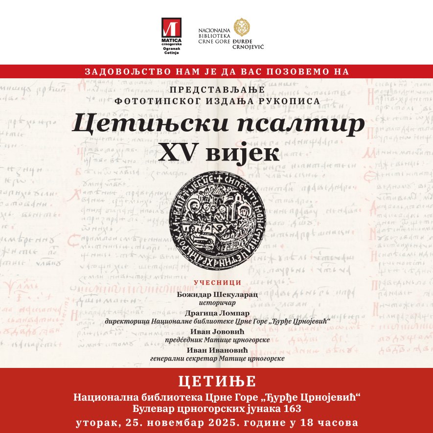Promocija fototipskog izdanja rukopisnog Cetinjskog psaltira iz XV vijeka biće održana u utorak, 25. novembra 2025. godine u 18 sati na Cetinju u organizaciji Matice crnogorske Ogranak Cetinje i Nacionalne biblioteke Crne Gore. Na promociji će govoriti Božidar Šekularac, istoričar, autor predgovora, priređivači Dragica Lompar, direktorica NBCG „Đurđe Crnojević“ i Ivan Ivanović, generalni sekretar Matice crnogorske i Ivan Jovović, predsjednik Matice crnogorske.