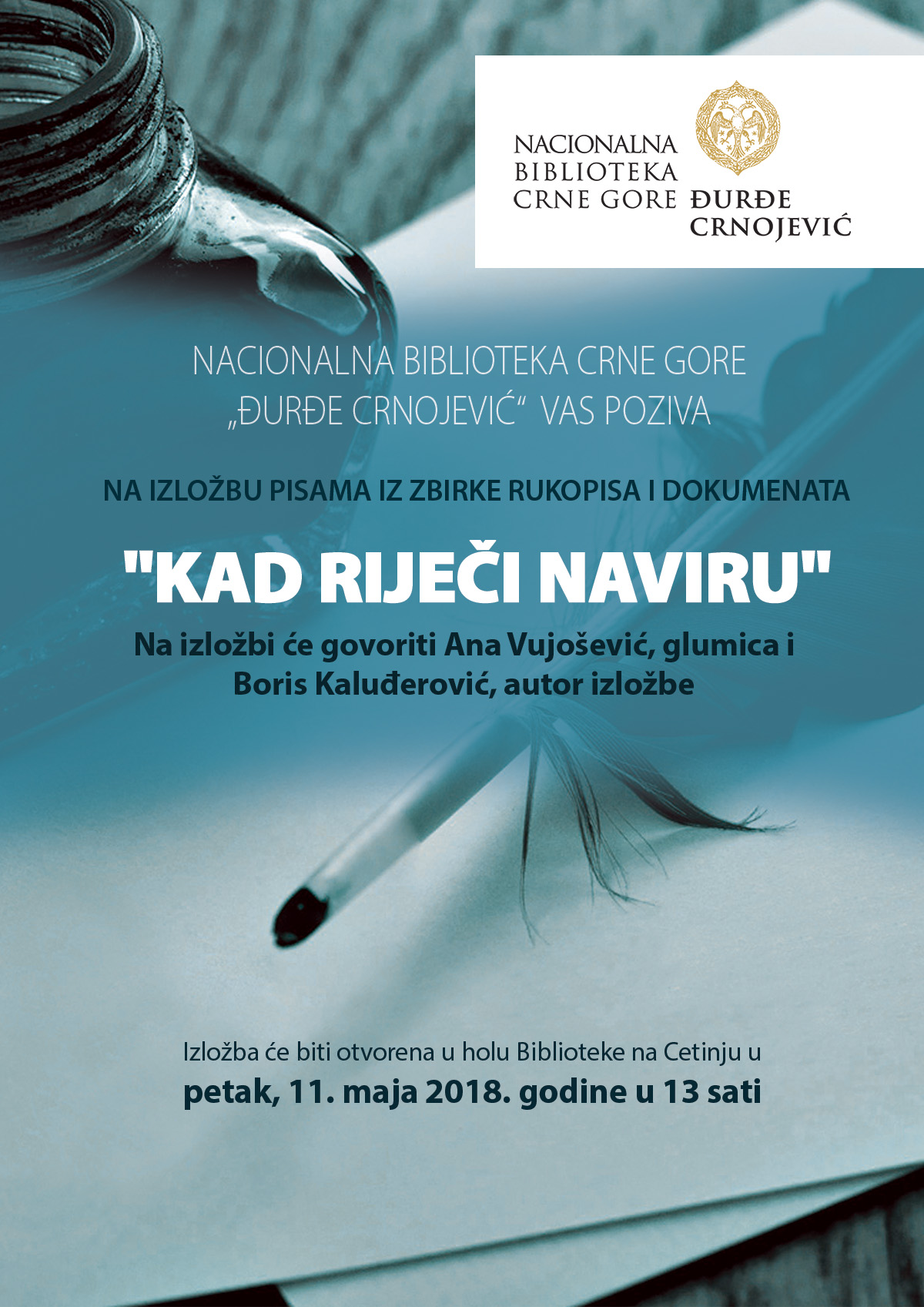 Izložba pisama „Kad riječi naviru“ biće otvorena u holu Nacionalne biblioteke Crne Gore „Đurđe Crnojević“ u petak, 11.05.2018. godine, u 13 časova.