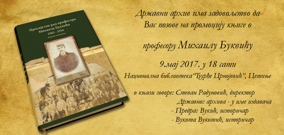 U Nacionalnoj biblioteci Crne Gore će, u utorak 9. maja 2017. godine, sa početkom u 18 časova, biti promovisana knjiga o profesoru Mihailu Bukviću. O knjizi će govoriti Stevan Radunović, direktor Državnog arhiva Crne Gore i istoričari Predrag Vukić i Vukota Vukotić.