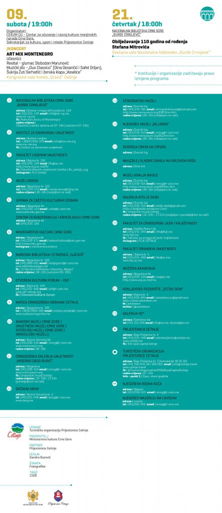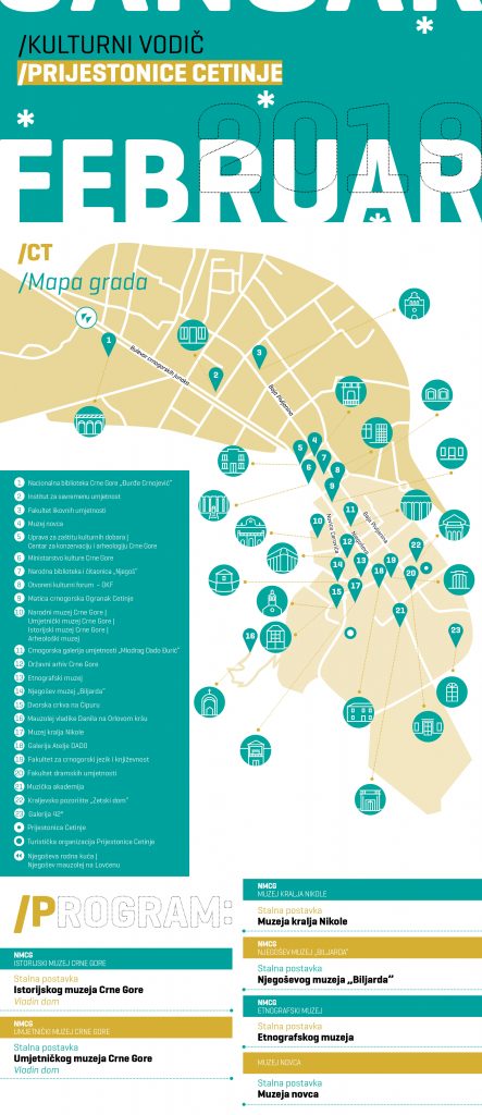 Kulturni vodič, u formi mjesečnog repertoara, sadrži programe i događaje koje organizuju institucije kulture i fakulteti na Cetinju.