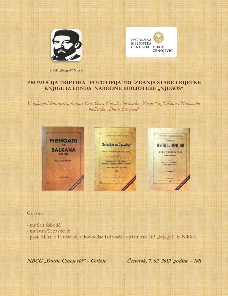 U četvrtak, 7. februara u Nacionalnoj biblioteci „Đurđe Crnojević“ na Cetinju biće predstavljene fototipije starih i rijetkih izdanja iz fonda JU Narodne biblioteke „Njegoš“ iz Nikšića.