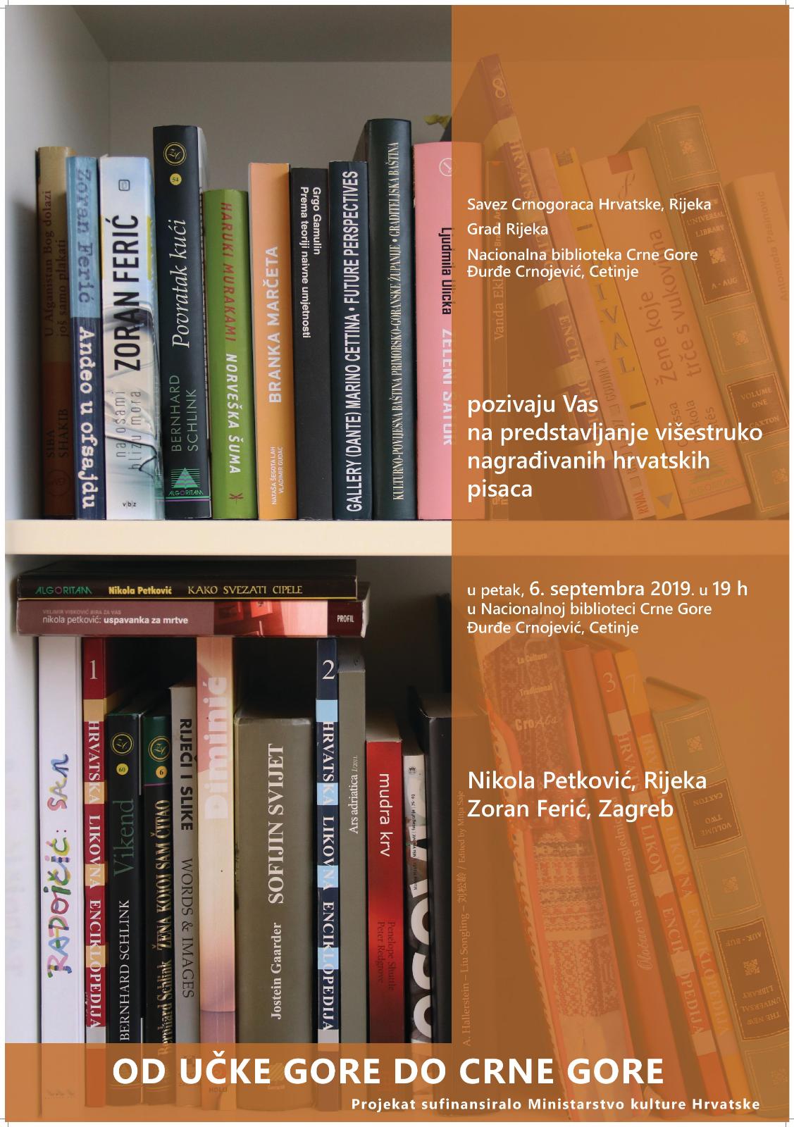 U okviru dugogodišnje uspješne kulturne saradnje, Nacionalna biblioteka Crne Gore „Đurđe Crnojević“, Cetinje, i Savez Crnogoraca Hrvatske, Rijeka, organizuju književno veče savremenih hrvatskih autora Nikole Petkovića i Zorana Ferića, pod nazivom „Od učke gore do Crne Gore“.