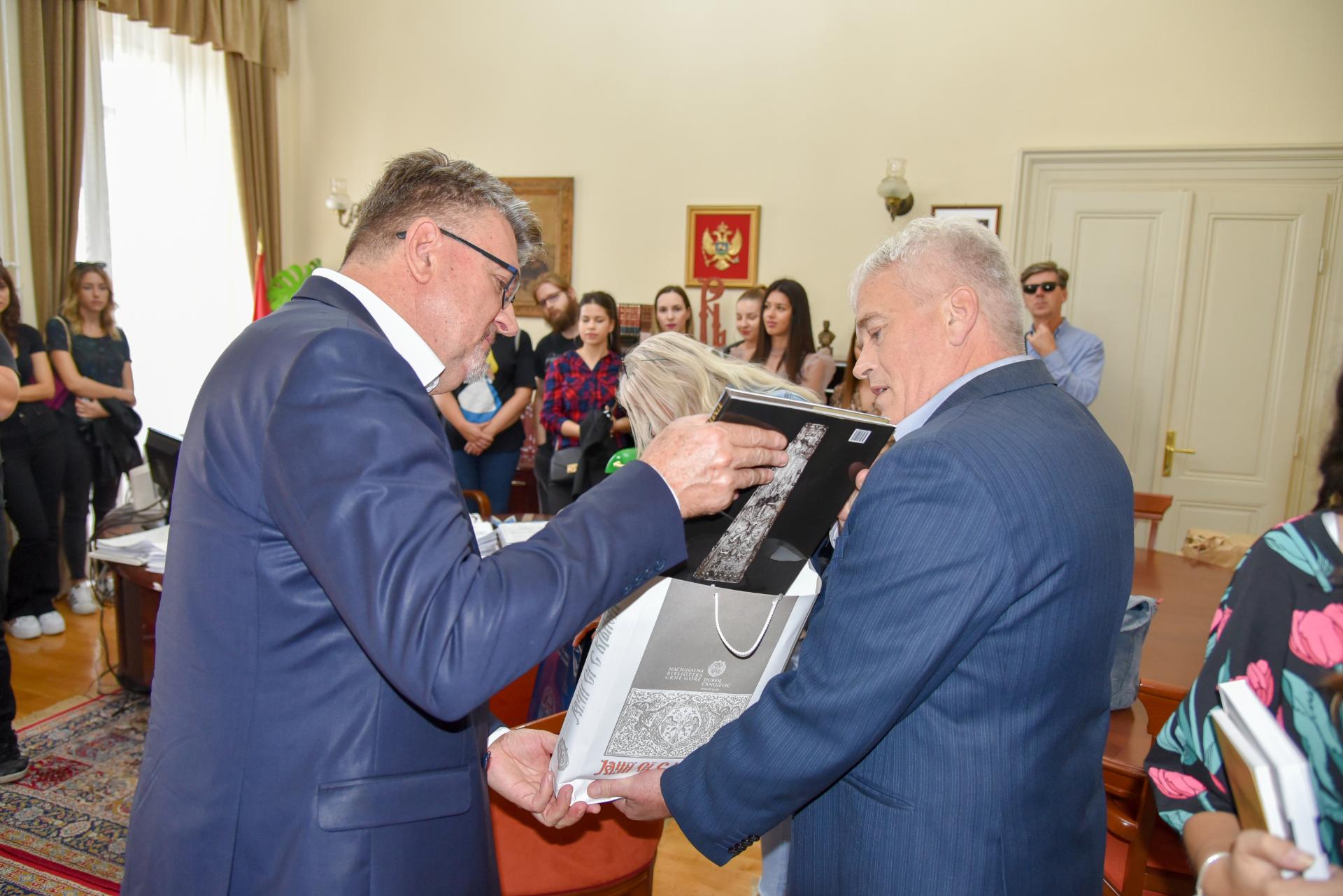 Uvažene goste pozdravili su ambasador Republike Hrvatske u Crnoj Gori Veselko Grubišić i Bogić Rakočević, direktor Biblioteke, koji je gostima uručio prigodan poklon - komplet knjiga, izdanja NBCG.