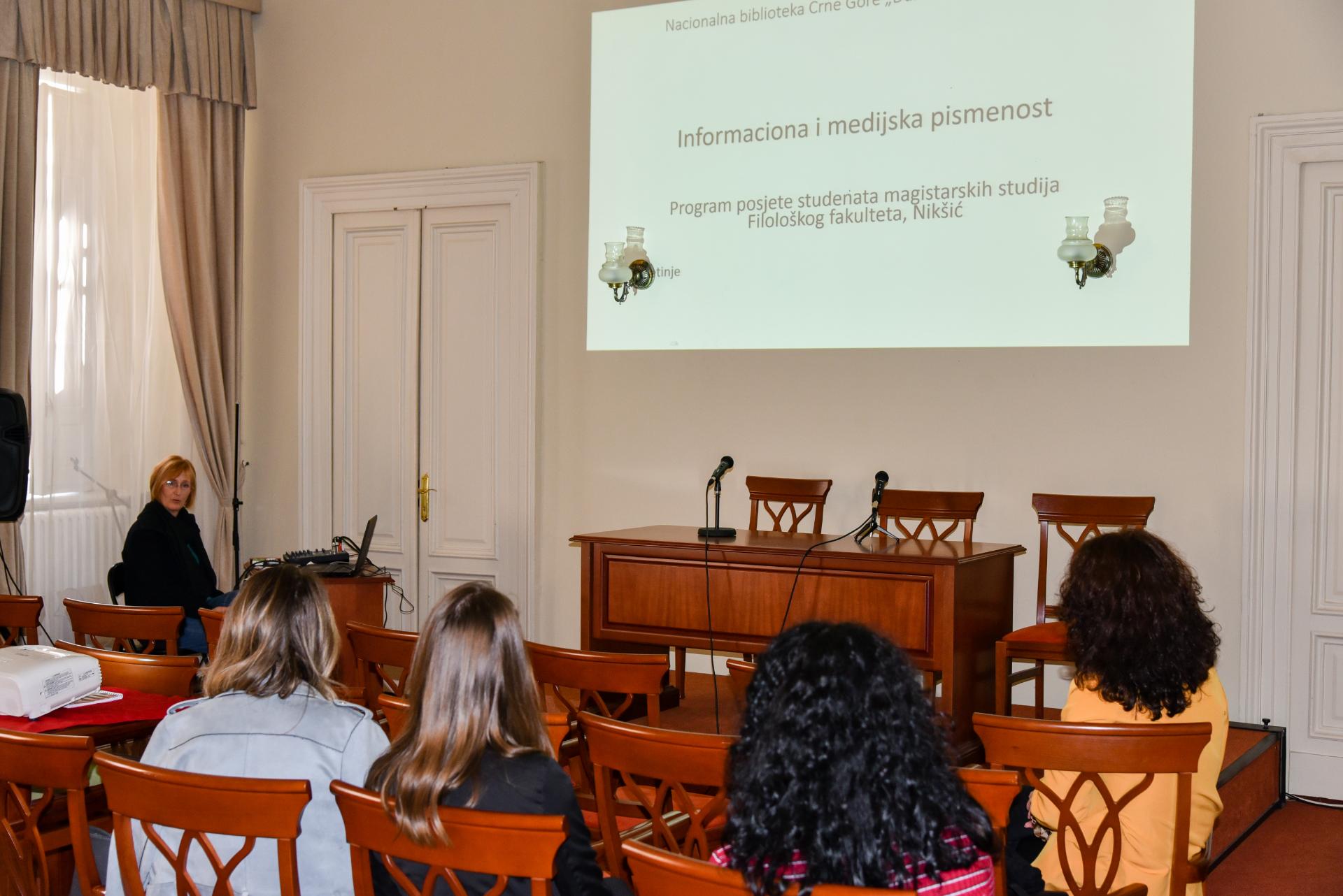 „Retrospektivna i nacionalna bibliografija” bila je tema prezentacije Milorada Milovića, bibliotekara savjetnika, a Digitalnu biblioteku Crne Gore studentima je predstavila Zorica Sjekloća, viša bibliotekarka.