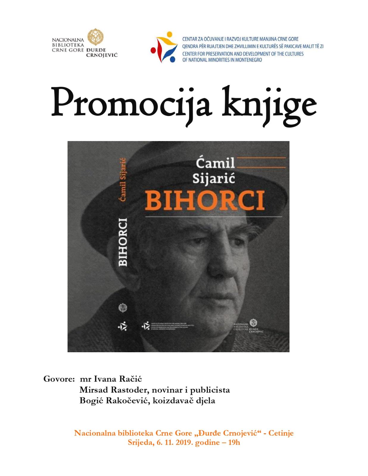 Roman „Bihorci” poznatog pisca iz Crne Gore Ćamila Sijarića, koji je nedavno objavljen u izdanju Nacionalne biblioteke Crne Gore „Đurđe Crnojević” i Centra za očuvanje i razvoj kulture manjina Crne Gore, biće predstavljen u srijedu, 6. novembra, u Biblioteci na Cetinju.