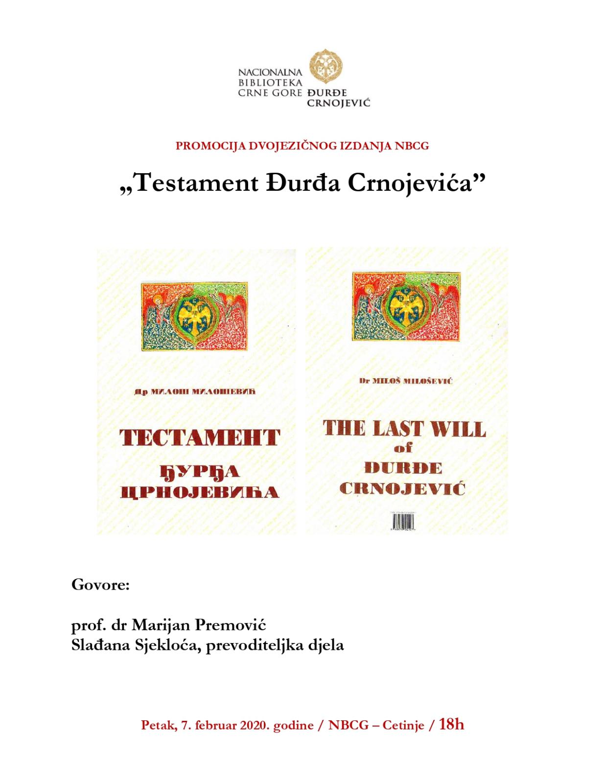 Promocija dvojezičnog izdanja „Testament Đurđa Crnojevića“ biće održana u petak, 7. februara, u Nacionalnoj biblioteci Crne Gore „Đurđe Crnojević“ na Cetinju, s početkom u 18 sati.
