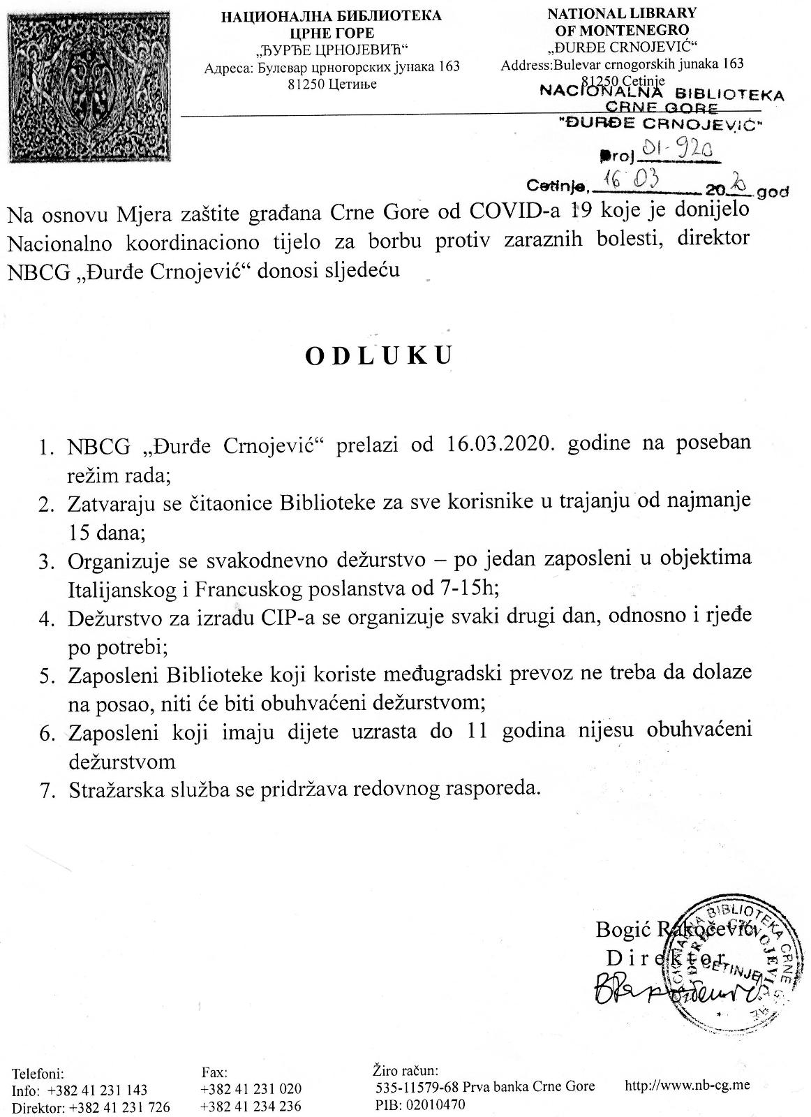 Na osnovu Mjera zaštite građana Crne Gore od COVID-a 19 koje je donijelo Nacionalno koordinaciono tijelo za borbu protiv zaraznih bolesti, direktor NBCG "Đurđe Crnojević" donijeo je odluku navedenu u prilogu.