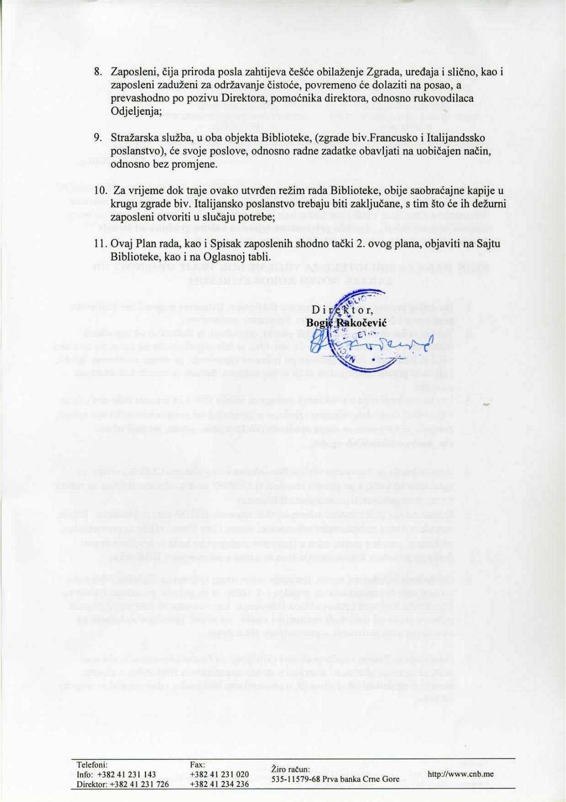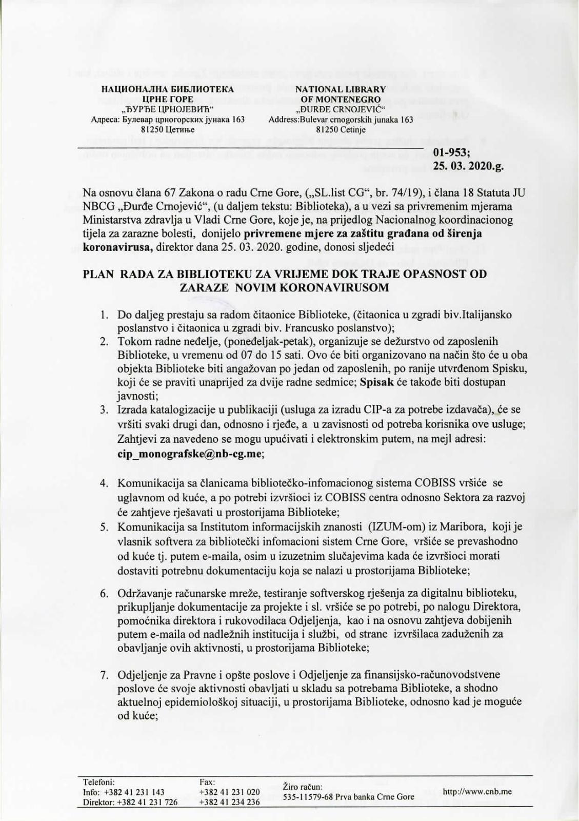 Na osnovu člana 67 Zakona o radu Crne Gore, („SL.list CG“, br. 74/19), i člana 18 Statuta JU NBCG „Đurđe Crnojević“, (u daljem tekstu: Biblioteka), a u vezi sa privremenim mjerama Ministarstva zdravlja u Vladi Crne Gore, koje je, na prijedlog Nacionalnog koordinacionog tijela za zarazne bolesti, donijelo privremene mjere za zaštitu građana od širenja koronavirusa, direktor dana 25. 03. 2020. godine, donosi sljedeći