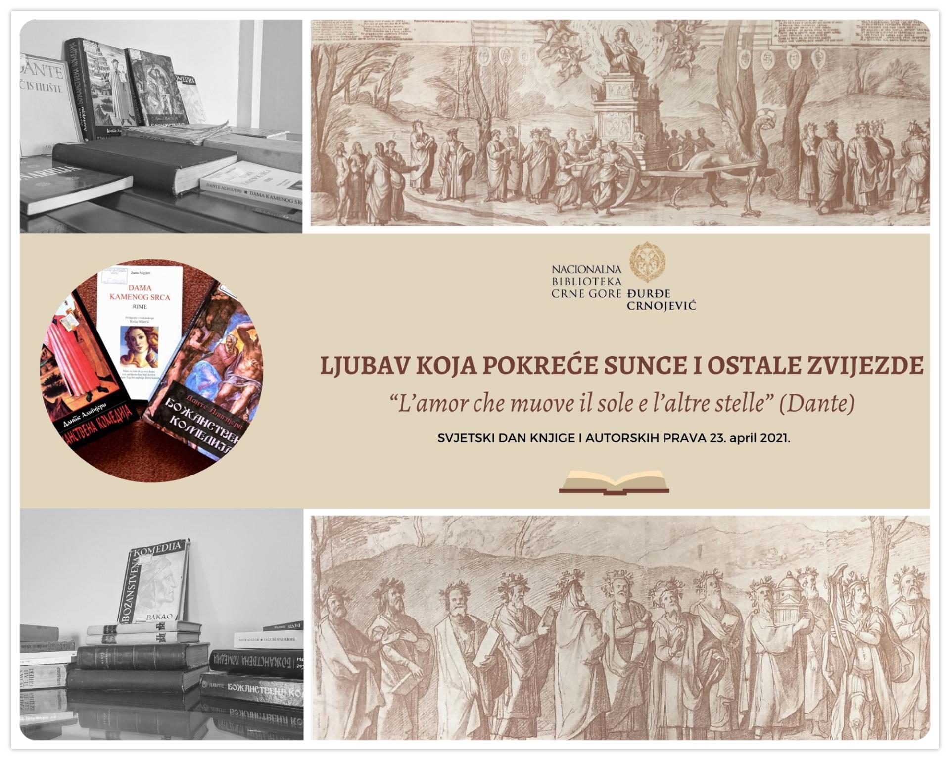 Povodom obilježavanja 700 godina od smrti velikog italijanskog pjesnika i jednog od najvećih imena svjetske književnosti Dantea Aligijerija, Biblioteka je pripremila online predstavljanje najznačajnijih primjeraka “Božanstvene komedije” koje posjeduje u svojim fondovima, u vidu dvije video prezentacije i fotografija sa vrijednim ilustracijama koje krase ova izdanja. Zbog svojih univerzalnih poruka Danteovo književno djelo predstavlja dio svjetske literarne i kulturne baštine, i u njegovu čast se tokom 2021. godine u Italiji i širom svijeta organizuju različite manifestacije.