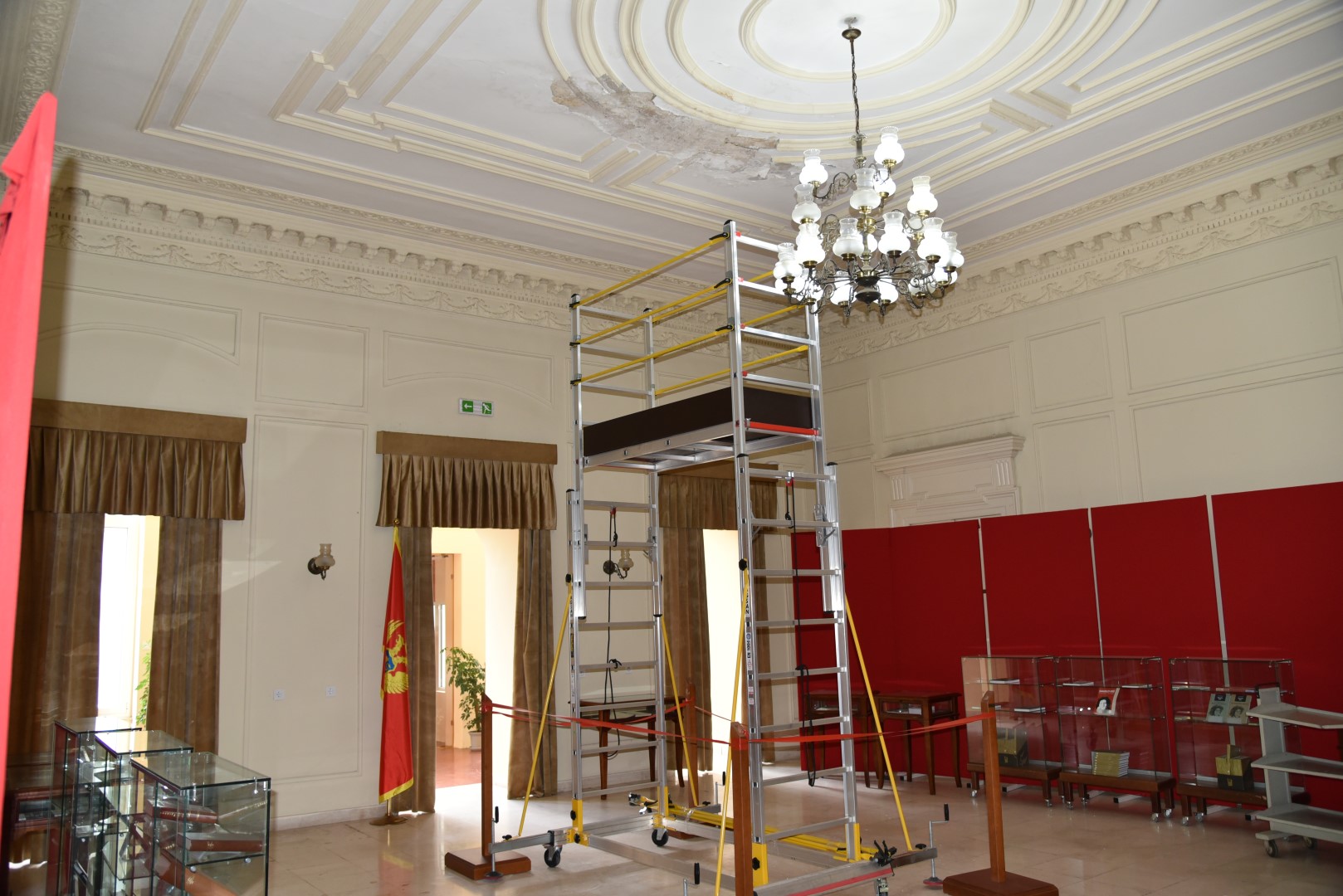 Usljed prodora vode sa jedne od terasa bivšeg Italijanskog poslanstva, došlo je do oštećenja i otpadanja dijela plafona i ukrasne plastike u svečanoj sali. Zbog toga je bila potrebna hitna intervencija koja se sastoji od postavljanja nove hidroizolacije i zamjene kamenih ploča na pomenutoj terasi, saniranja oštećenja tavanice, postavljanja nedostajuće ukrasne plastike i krečenja plafonskih i zidnih površina.
