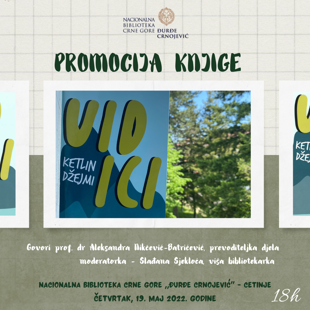 Promocija knjige „Vidici“, autorke Ketlin Džejmi biće održana u četvrtak, 19.05.2022. u Nacionalnoj biblioteci Crne Gore „Đurđe Crnojević“, sa početkom u 18h.