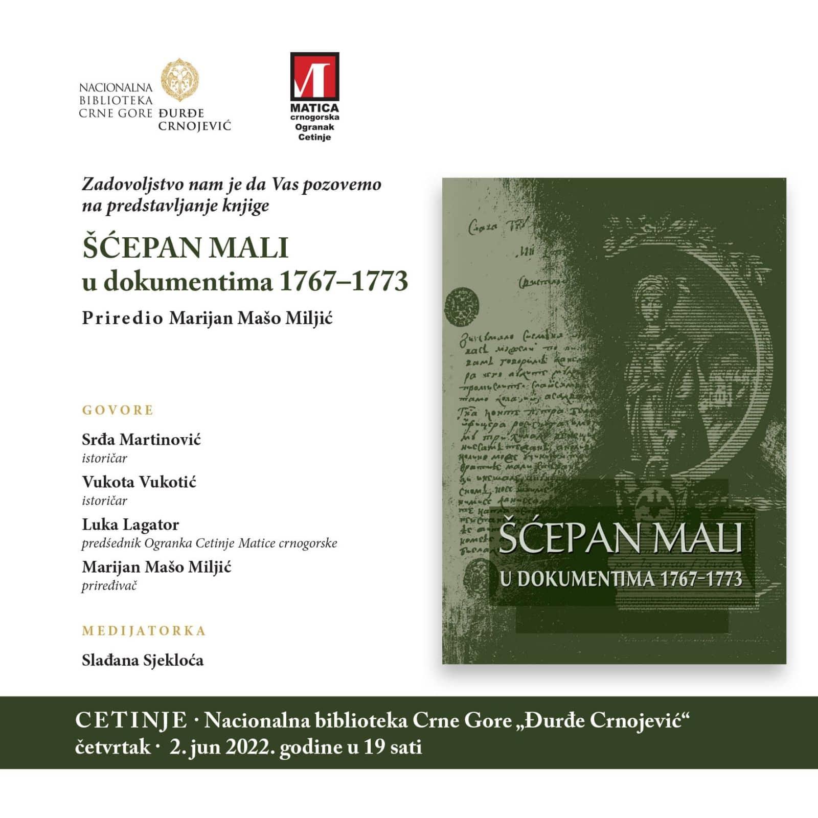 Promocija će se održati u Nacionalnoj biblioteci „Đurđe Crnojević“, u četvrtak, 2. juna 2022. godine u 19 sati. Matica crnogorska je izdavač zbornika „Šćepan Mali u dokumentima 1767–1773”. Izdanje je priredio Marijan Mašo Miljić, koji je ujedno i autor predgovora. Zahtjevan urednički posao uradila je Vesna Kilibarda. Svojom ličnošću i državničkim djelovanjem Šćepan Mali je ostavio neizbrisiv trag u crnogorskoj istoriji. Uprkos brojnim pokušajima da se utvrde njegovo porijeklo i identitet, zagonetka Šćepana Malog ipak nije riješena. Matica crnogorska ovim izdanjem želi doprinijeti izučavanju građe o ovoj misterioznoj ličnosti naše nacionalne istorije. Zbornik sadrži dio neobjavljene građe, kao i objavljenu građu o ovoj misterioznoj i značajnoj ličnosti u istoriji Crne Gore. Nepublikovana građa je dominantno iz Bogišićevog arhiva u Cavtatu i u ovom zborniku se prvi put objavljuje cjelovito. Zbornikom je obuhvaćena građa objavljena od XIX vijeka do danasu zbirkama dokumenata, zbornicima građe i drugim monografskim izdanjima, kao i u periodičnim publikacijama kod nas i u inostranstvu, na izvornim jezicima i u prevodu sa njih. U Zborniku se prvi put objavljuju prevodi dokumenata koji su bili poznati i do sad korišćeni samo na italijanskom, ruskom, francuskom i njemačkom jeziku. Najviše dokumenata je iz mletačkih i ruskih arhiva. Zbornik Šćepan Mali u dokumentima 1167–1773 sadrži ukupno 441 dokument na preko hiljadu strana.