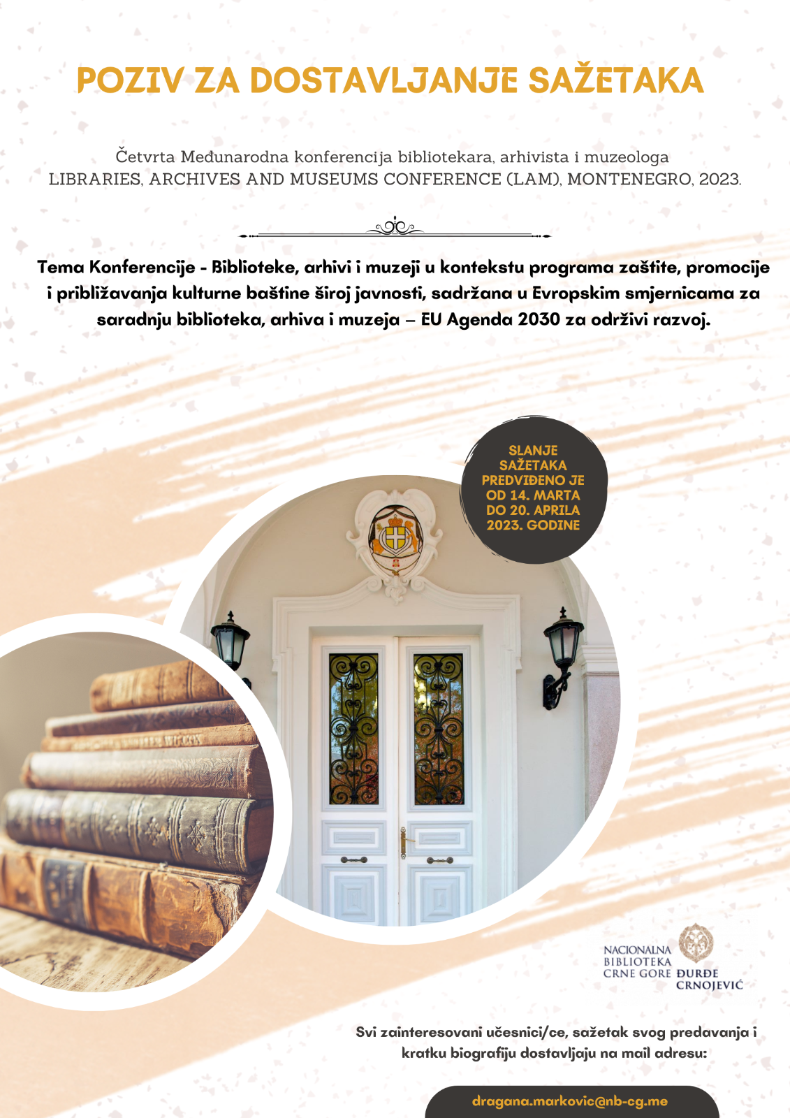 P O Z I V Četvrta Međunarodna konferencija bibliotekara, arhivista i muzeologa "Libraries, Archives and Museums Conference (LAM), Montenegro, 2023."