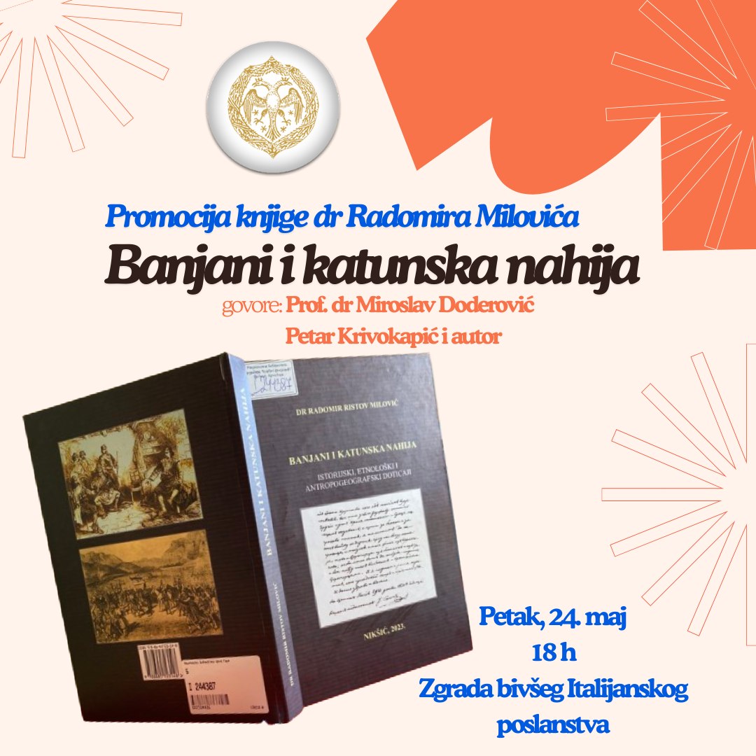 Promocija knjige „Banjani i katunska nahija“ dr Radomira Milovića biće održana u petak, 24. maja u Nacionalnoj biblioteci Crne Gore (bivša zgrada ambasade Italije), sa početkom u 18 časova. Dobro došli!